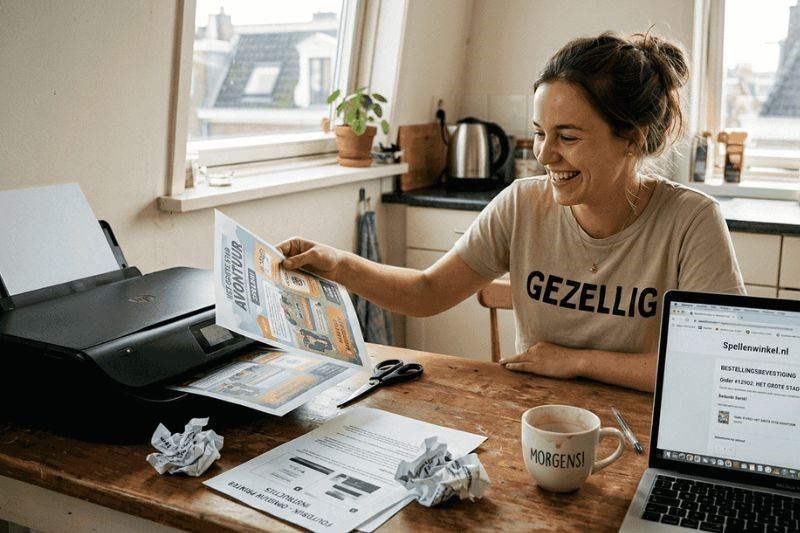 Je hebt alleen een standaard printer, gewoon printerpapier en een schaar nodig voor basis printbare spellen. Voor duurzamer materiaal kun je steviger papier of karton gebruiken en componenten eventueel lamineren. De meeste spellen werken prima met standaard A4 papier en vereisen geen speciale printtechnieken of dure apparatuur.